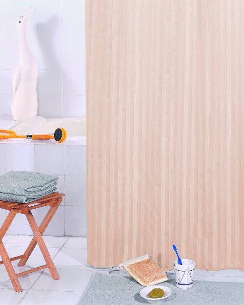 Занавеска из 100% полиэстера для ванны с 16 люверсами под кольца. Цвет: бежевый в полоску. Штора обработана специальной пропиткой, отталкивающей воду. Внизу по всей длине вшит шнур-утяжелитель.